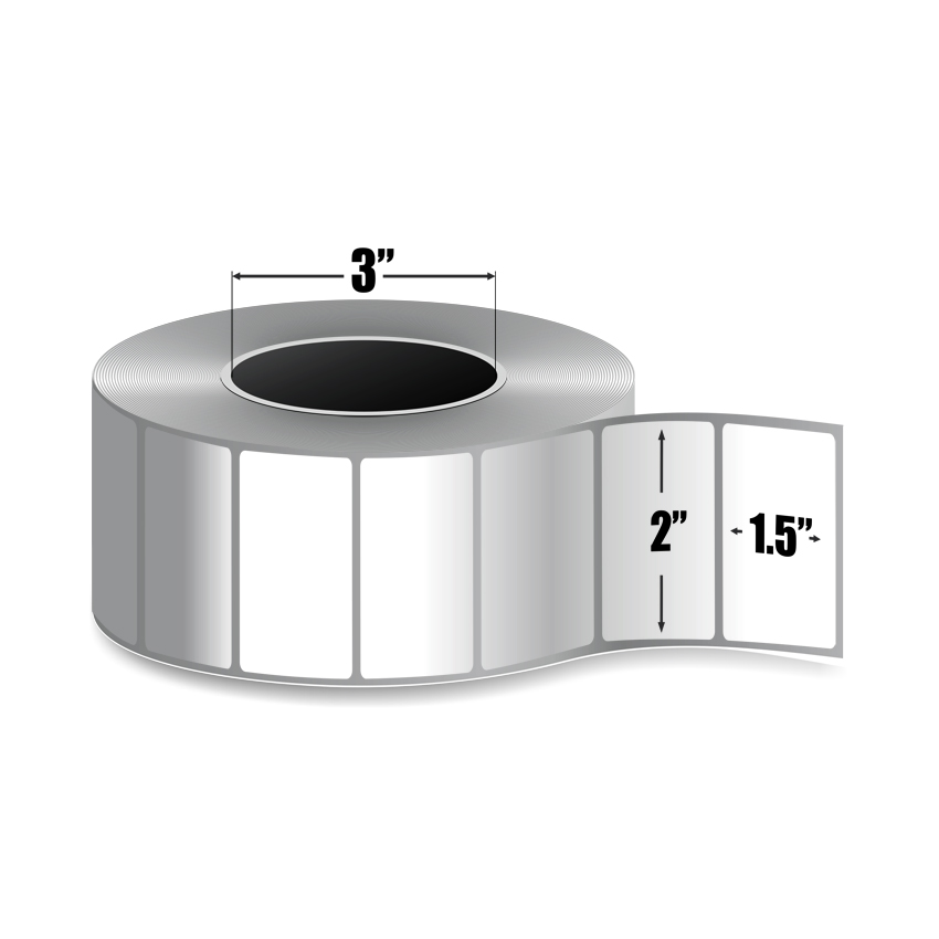This 2" x 1.5" White Thermal Transfer label comes on a 3" core with a 8" outer diameter. There are 8 rolls per box and 3760 labels per roll.