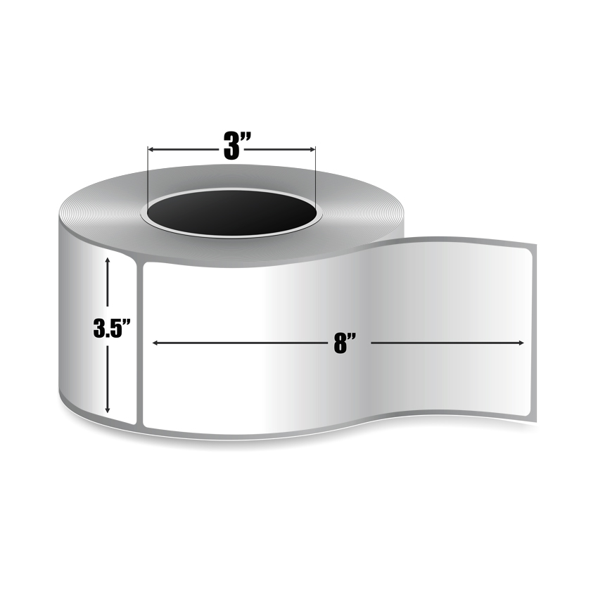 This 3.5" x 8" White Thermal Transfer label comes on a 3" core with a 8" outer diameter. There are 4 rolls per box and 750 labels per roll.