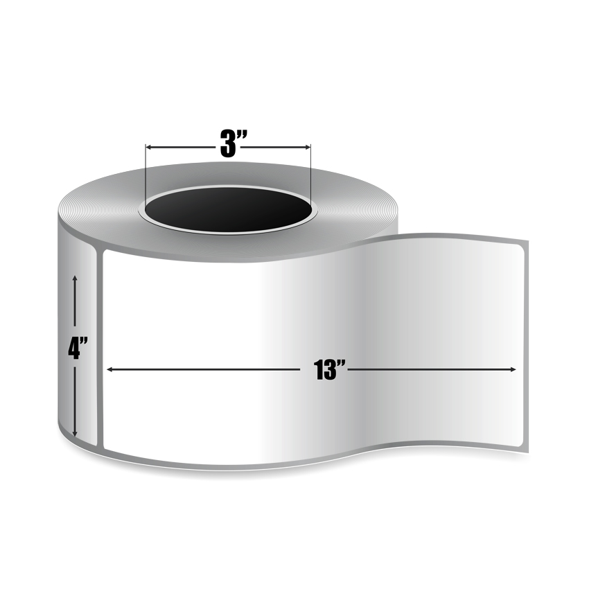 This 4" x 13" White Thermal Transfer label comes on a 3" core with a 8" outer diameter. There are 4 rolls per box and 465 labels per roll.